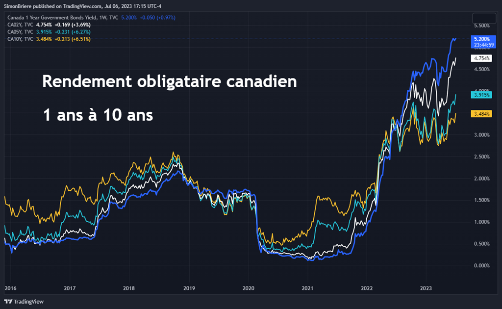 Au Canada c’est la même chose. Les rendement obligataires (taux d’intérêts) sont à la hausse (ENCORE) depuis le printemps. Grand’pa est mort de rire avec son CPG à 5.60% et sa maison payée, mais pour un bon nombre de personne c’est de moins en moins drôle et de plus en plus inquiétant.