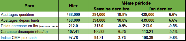 Contrairement aux valeurs des coupes de bœuf, si on regarde les valeurs des différentes coupes de porc dans les abattoirs, on peut noter que malgré la hausse récente, les prix demeurent inférieurs aux prix de l’an dernier. La remontée du bacon récemment qui grimpe de 80% depuis 1 mois, son prix demeure sous le niveau de 2022 de presque 13% Le jambon et les longes demeurent sous le niveau de 2022 de 2 à 3%. Pour le consommateur c’est excellent si cette baisse est véritablement refilée aux clients.