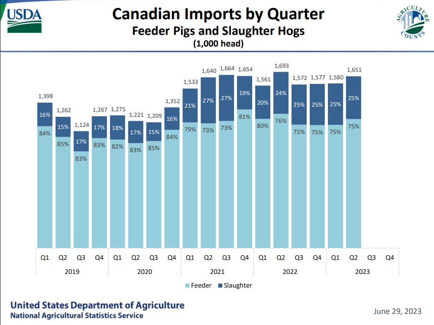 Les exportations récemment n’ont pas été extraordinaires en juin comparativement au mois de mai. Et juillet est correct, sans plus. Cependant, le fait d’exporter un peu plus que ce que le USDA avait prévu c’est une bonne chose pour les prix de la découpe et au comptant. Ne manque plus que le nombre de cochons diminue et les prix pourraient connaitre un soubresaut intéressant dans les prochaines semaines. Le dernier rapport Hog & Pig rapportait que les intentions de mises-bas pour cet été et automne devraient être en fortes baisses (-4%) et que si on ajuste avec la productivité des truies, nous devrions, tout de même, nous retrouver avec 1% ou 1.5% moins de porc à partir de décembre et au début de 2024. Le prix des porcelets demeurent anormalement bas et devrait se stabiliser au cours des prochains jours. Normalement ces prix devraient remonter, mais si ce n’est pas le cas, peut-être cela sera LE signal pour constater une confirmation de la diminution de la production dans les prochains mois (ou si on a une tendance sous les moyennes des dernières années)!