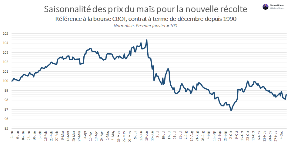Ha. Ha. Bon vous comprenez ce que je veux dire maintenant par saisonnalité. Appliqué au cours de la bourse (CBOT), ce que je fais c’est que je prends l’historique des 30 dernières années. Depuis 1990, tiens. Ça me fait penser à Jean Le Loup pis j’vous met la toune dans la tête aussi. De rien. Je pend le prix du 1er janvier, et je regarde la variation de prix en pourcentage. En faisant la moyenne de tous les pourcentages je construis un graphique. Le premier janvier, je commence à compter. En partant d’un indice 100 je peux aisément suivre l’évolution et je me rend compte que le prix a tendance a grimper pendant le printemps jusqu’en juin. En juin l’indice est à un peu plus de 104, c’est-à-dire que les cours ont tendance a monter de 4% en moyenne. C’est une moyenne, parfois c’est plus, parfois c’est moins. Et ensuite BANG, les prix chutent assez fortement. L’incertitude du printemps par rapport aux surfaces, météo et rendement de dissipent et poussent les prix à la baisse. Encore là, c’est une moyenne. On passe d’un prix en hausse de 3-4% à un prix en baisse de 2-3% en peu de temps. Ensuite la situation se stabilise et remonte un peu pendant/après les récoltes. Pis après on mange de la dinde à Noel, et on recommence toute la patente pour l’année suivante.