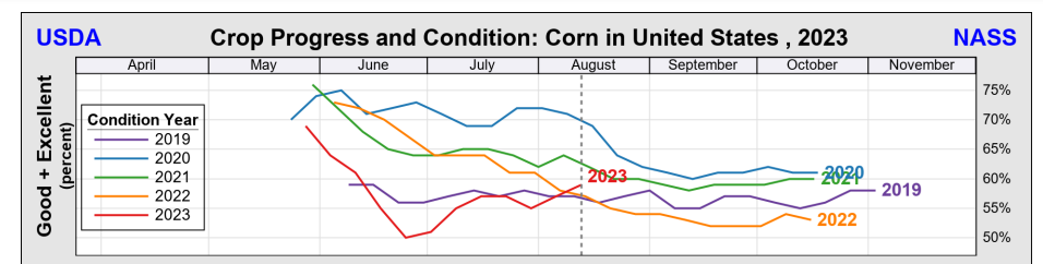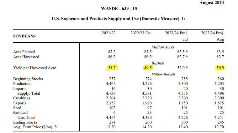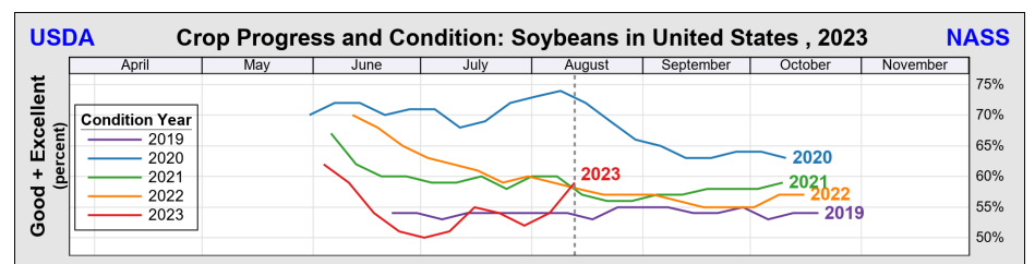 Il faut absolument noter que dans le soya, les conditions publiées hier sont meilleures les mêmes que l’an dernier à la récolte (Bonnes/Excellentes 59 versus 58). Le USDA prévoit 50.9 boisseaux/acre. Peut-on imaginer une hausse des rendements dans le prochain rapport à la lumière des conditions du mois d’août? SI les conditions sont meilleures qu’en 2022 et 2021, le USDA sera-t-il forceé de revenir à 52 boisseaux/acre pour son estimation? Évidemment, il n’y pas de corrélation parfaite entre conditions et rendements, mais on peut suspecter la chose. Les contrats à terme régissent sans trop réagir préférant attendre encore un peu.