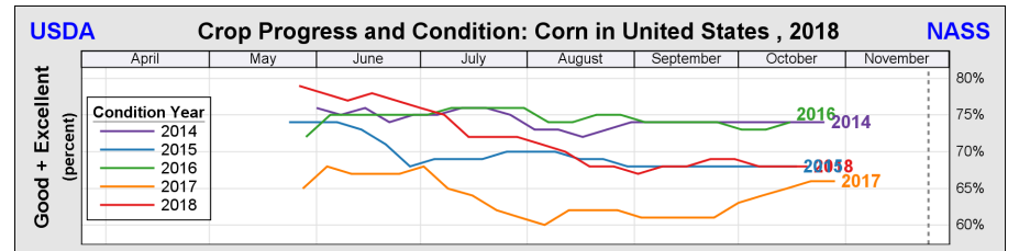 Mais cette année est une année particulière alors que le USDA rapportait hier que les conditions dans le mais et dans le soya continuent de s’améliorer. Il est TRES rare qu’à cette période-ci de l’été les conditions s’améliorent autant. Normalement, les récoltes ont tendance à perdre en qualité plus l’été avance. C’est la tendance naturelle et saisonnière, mais étrangement pas cette année! Ce qui donne du poids aux estimations de rendements du USDA de vendredi dernier et peut-être même suggérer des idées d’une légère amélioration des rendements lors des récoltes qui vont débuter très bientôt pour les États du Sud. (La Louisiane a récolté près de 45% de sa récolte de mais en date de dimanche dernier – c’est très rapide!). Ces bonnes nouvelles concernant la qualité de la récolte à venir pèsent sur les prix des grains. C’est inévitable!