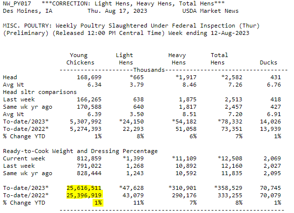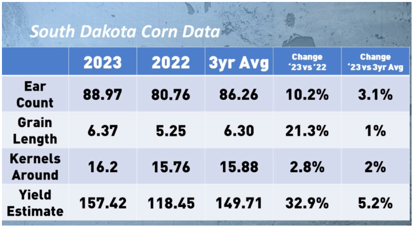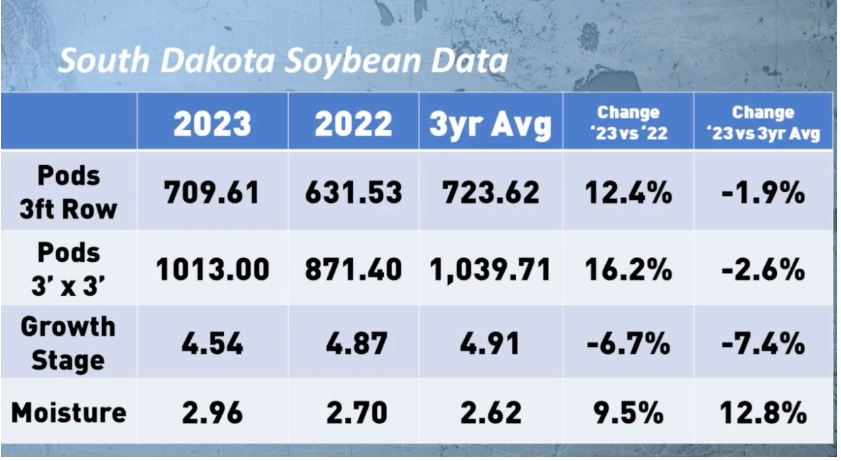 Voici les résultats préliminaires pour le maïs et le soya. Au fond, on constate que les récoltes seront bonnes et satisfaisantes. Dans le Dakota du Sud, on note que les épis n’auront probablement pas de problème de ‘’tip-back’’. Les problèmes de sécheresse de 2022 sont vraiment choses du passés et que les rendements seront excellents. Quant au soya, même chose, le fait d’avoir semé rapidement au printemps ont fait en sorte que les pluies de fin juillet et août produiront un résultat intéressant. On pense même dépasser le niveau de 42 boisseaux /acre publié par le USDA dans son rapport du mois d’août