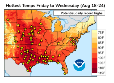 Mais le rebond sur les grains depuis la semaine dernière est principalement dû aux conditions de chaleur extrême aux États depuis ce weekend et ce lundi. On parle même de records de chaleur à certains endroits. Peu ou pas de pluie sont prévues entre aujourd’hui et le début septembre. Voilà le stress hydrique de fin de saison pour le Midwest américain. Pour ceux qui sont en manque de chaleur ou de soleil, le Kansas pourrait s’avérer une belle destination vacances avant vos récoltes avec des température atteignant les 46 degrés Celsius…