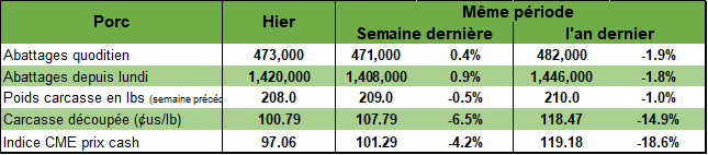 Pour l’instant, le nombre de porcs envoyés aux abattoirs est en baisse de 26 000 porcs par rapport à 2022. Rien d’excitant à rapporter cette statistique. Le poids des carcasses demeure aussi obstinément en baisse par rapport à 2022. Rien de nouveau ici, et le marché s’en balance complétement aussi. Mais ce sont des faits qui pourraient rattraper le marché éventuellement.