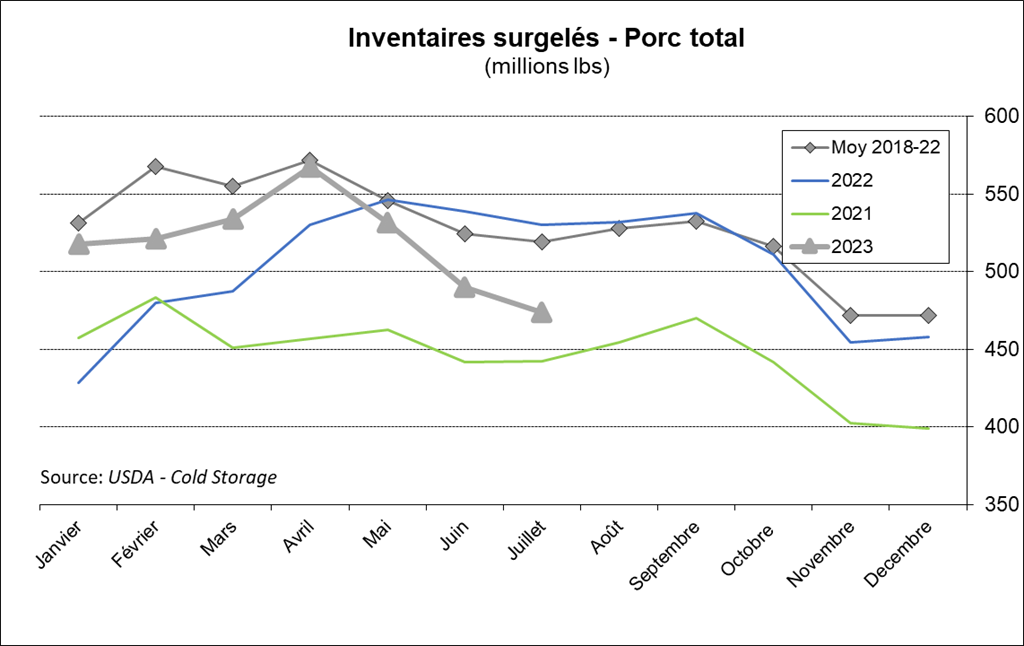 Ce qui peut être pertinent de rapporter serait 2 choses ce matin : 1) les données d’exportation qui, enfin, montrent des signes de vie intéressants et 2) le niveau des inventaires de viande porcs détenus dans les congélateurs américains.