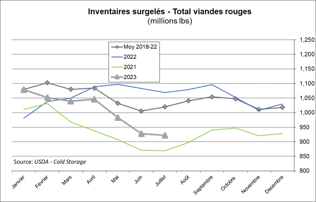 Le rapport de Cold Storage a apporté son lot de surprises positives selon moi. Les chiffres, en absolu, ne signifient pas grand-chose puisque ceux-ci représentent assez peu de production (moins de 1 semaine de production habituellement), mais ce qu’il faut chercher ce sont les anomalies de stockage ou le déstockage des inventaires versus les autres années. C’est souvent un signe afin de voir si la demande est forte ou moins forte pour la viande pendant un mois donné. Et pour un 2ieme mois consécutif, la demande semble plus forte que les années précédentes durant le mois de juillet (juin était aussi un mois de forte demande) malgré une stabilité dans la production. (plus de porcs, mais moins de viande en juillet). Et quand on regarde, les inventaires de viandes rouges, on s’aperçoit que les volumes conservés en inventaires sont relativement bas. En fait, on s’approche des niveaux pandémiques…