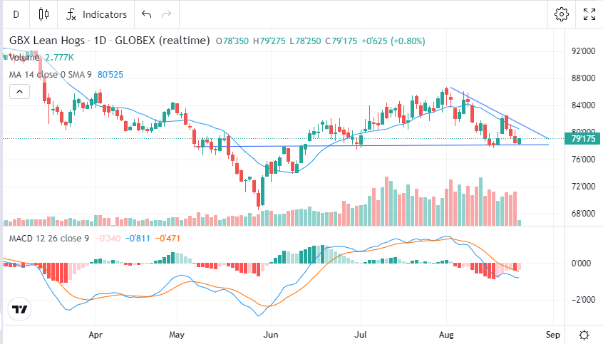 Nous approchons la fin du mois d’août et c’est le moment critique dans le porc. Normalement, les contrats à terme devraient reprendre de la vigueur à partir de demain (25 août). Je n’ai pas de boule de crystal et je ne suis pas en couple avec Jojo Savard ou Lumina Gendron ou autres diseuses de bonne aventure, mais d’après l’historique, le passé nous indique qu’il existe une saisonnalité forte pour effectuer une remontée dans les prochaines semaines. Jusqu’où? quel prix pouvons -nous atteindre? C’est LA question et le dilemme pour tout négociant. A plusieurs reprises les creux se situant autour de $78.25. Ce niveau a bien tenu et a bien joué le rôle de support. Pour être positif à court terme, il faudrait traverser la moyenne mobile 14 jours ainsi que la ligne de tendance baissière amorcée début août. Les niveaux de $80.85/ $81.00 seront grandement à surveiller. Si jamais on devait passer ce cap, un retour autour de $84.00 n’est pas exclu. Le MACD nous donne un indice supplémentaire quant au timing et le signal d’achat dont nous avons besoin pour baser notre décision.