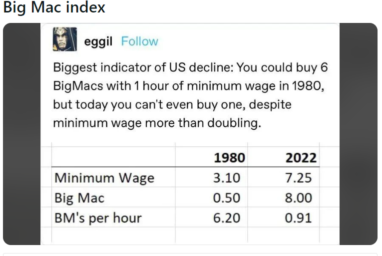 On parle souvent d’inflation alimentaire et le Bigmac est suivi par beaucoup d’analystes de par le monde. Mais un message sur Reddit datant de 8 mois proposait cette analyse sommaire et ça parle beaucoup! Auparavant, 1 heure travaillée au salaire minimum pouvait te procurer 6 BigMac! Aujourd’hui, une heure de travail ne te permet pas d’acheter un seul BigMac!!!