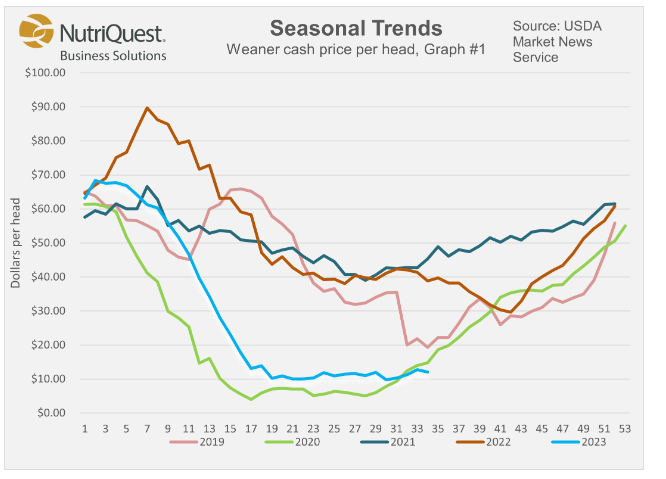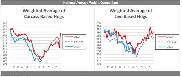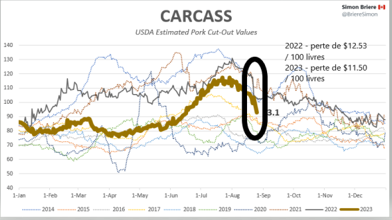 Je voudrais vous dire pourquoi le prix de la découpe chute ainsi fin aout, mais il n’y a pas de réponse ou pas de bonnes réponses. Ça doit être une question d’achat des acheteurs institutionnels aux États-Unis (hôpitaux, écoles, etc). Ils doivent certainement jouer un rôle non négligeable dans les achats de masse auprès des vendeurs. A moins que ce ne soit les détaillants qui proposent des nouvelles grilles d’achat pour les derniers mois de l’année et les temps des Fêtes qui viennent (Thanksgiving en novembre et Noel en décembre – mais peut-être est-ce trop tôt?) Ou les fast-foods qui ajustent leur promotion en cette fin d’été (Wendy’s a proposé son Baconator cet été!) On sait que les restaurants ajustent leurs prix et que le portefeuille des consommateurs s’est rétréci en 2023. Voit-on vraiment une baisse de la demande? On entend encore parler de la technique des détaillants (supermarchés) voulant offrir du bœuf pas cher (marges négatives) et offrir du porc au gros prix (marges plus élevées) et ainsi ne pas refiler le prix du porc pas cher aux clients…. Si vous avez des idées, je suis preneur puisqu’aucun analyste ne propose de pistes pour éclaircir ce mystère.