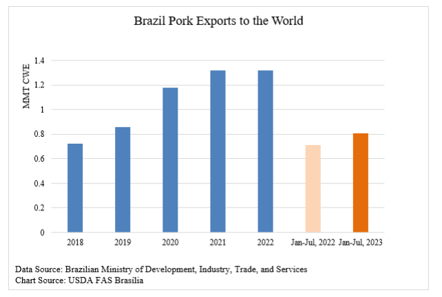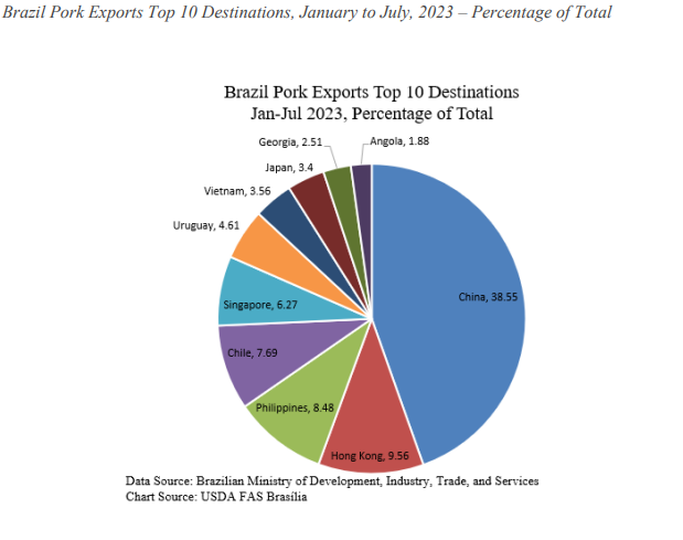 Dans le porc, le pays occupe la 5ieme place de tous les pays producteurs dans le monde. D’ailleurs c’est probablement le SEUL pays au monde qui connaitra une croissance de la production en 2023 et 2024. Il faut souligner que le Brésil est le 2ieme fournisseur de viande porc en Chine (le 1er étant l’Espagne).