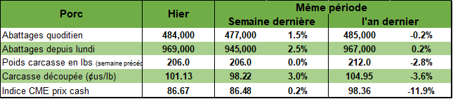 Le prix au comptant et la découpe démontrent encore de belles choses. Le prix ‘’cash’’ se stabilise autour de $86 USD / 100 livre. Mais la découpe est beaucoup plus intéressante en progressant et demeurant au-dessus de $100/100 livres (les marges des abattoirs sont très intéressantes!).