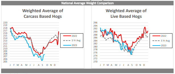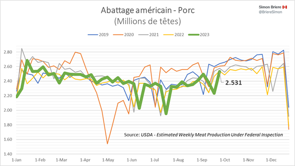 Le nombre de porcs abattus prend de l’ampleur sans trop faire bouger l’aiguille des acheteurs (c’est-à-dire le prix au comptant). La semaine dernière, l’industrie a abattu 2 531 000 porcs et c’était un nombre de porcs le plus élevé depuis janvier 2023. Ce nombre était 1.8% supérieur à 2022 (et on repose la question : ‘’d’où viennent tous ces porcs?!’’), mais quand on intègre la donnée des poids, on obtient 1.2% MOINS de viande! Cette diminution de production de viande fait en sorte qu’on bouge les produits plus facilement dans la chaine de distribution, au grand bonheur des abattoirs et grossistes.