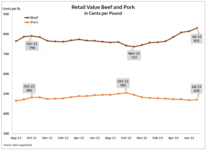 Ca parait que c‘est l’automne, les nouvelles sont plus rares et les choses un peu moins excitantes dans les viandes. Pourtant, les choses sont intéressantes pour les producteurs de viandes en général, et ce, pour différentes raisons. Dans le bœuf, de nouveaux sommets de prix ont été atteint récemment, le prix des veaux a aussi suivi. Étrangement, il n’y a pas de pessimiste dans ce marché. Les analystes sont tous convaincus que la réduction du cheptel va se poursuivre et aucune expansion n’est prévue en 2024. La seule ombre au tableau demeure la demande ou la consommation de la clientèle. Peut-on pousser encore et encore les prix au détail à des niveaux jamais vu? Les données des prix au détail indiquent que la viande de bœuf a atteint des niveaux records dans les épiceries en août. Le porc et le poulet demeurent sous les niveaux de prix de 2022. Cachez vos sandwichs à la viande froide, les voleurs sont prêts à tout!