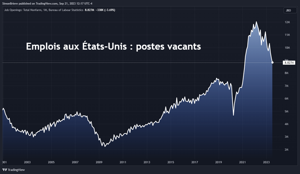 #11 Le nombre de postes vacants aux États-Unis continue de chuter. Certains postes sont comblés, et aussi révision à la baisse des besoins des entreprises. À force de chercher et pas trouver, on retire l'annonce. Également, les ventes ralentissent donc moins besoin d'employés.