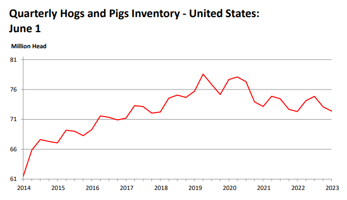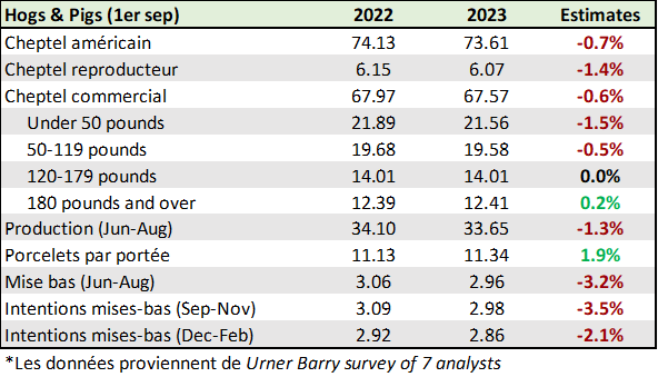 En gros on s’attend à une (autre) baisse de la taille du cheptel aux États-Unis en date du 1er septembre. Les chiffres comparent la même période ; été 2022 vs été 2023.