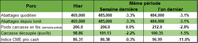 Le prix au comptant fait du surplace, ce qui est une demie-victoire dans les circonstances. Normalement, avec les abattages quotidiennes ou hebdomadaires de l’automne, le prix au comptant a toujours tendance à reculer, mais pas cette fois-ci, du moins pas encore! Bien que le contrat à terme d’octobre se transige à 82.00 USD / 100 livres, le niveau du prix cash se situe encore à 86.00$. Doit -on y voir le pire pour le prix cash dans 2 prochaines semaines ou peut-on voir un rebond du contrat d’octobre. Le prix de la découpe oscille elle aussi autour de son niveau de $100 / 100 livres (un peu en dessous / un peu au-dessus).
