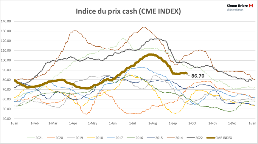 Le rapport de Cold Storage a démontré que les inventaires ont diminué en août. Ce ne sont pas les inventaires bruts qui sont intéressants, mais bien la direction des entrées et des sorties de ces inventaires. Ainsi en août, nous avons puisé dans les inventaires pour satisfaire la demande ce qui est un peu contra-cyclique. De plus, on s’approche des creux des inventaires de 2021.