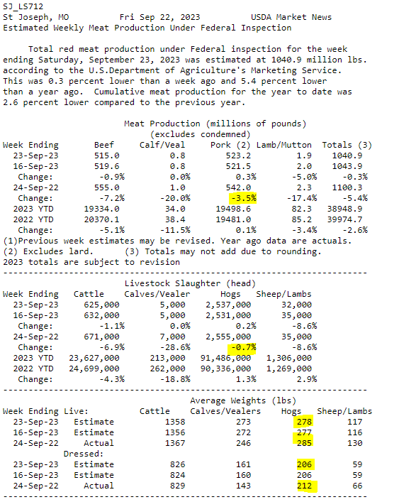 Mais ce qui retient beaucoup mon attention, et d’autres analystes en ont parlé récemment. La quantité de viandes disponibles pour les détaillants et consommateurs. Il est vrai que nous nous dirigeons vers de grosses semaine d’abattages (les plus élevés de toute l’année), mais quand on regarde la production générale, le résultat est assez surprenant. Le USDA, dans son rapport hebdomadaire, rapportait que la quantité de viande porc avait reculé de 3.5% versus l’an dernier. Et même le nombre de porcs abattus était en hausse de 0.7% par rapport à 2022. Le poids carcasses des porcs transformées est en forte baisse par rapport à 2022. Pour les lecteurs ce cette chronique, ce n’est pas une surprise, j’en ai parlé abondamment depuis les derniers mois. Le marché occultait ce fait puisque le nombre de cochons étaient toujours supérieurs aux attentes, mais qu’en est-il si jamais le nombre de porcs devaient baisser? L’effet négatif (réduction de la viande) serait positif (sur les prix!) Vous suivez!
