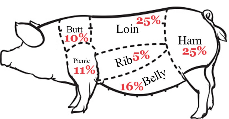 C’Est une moyenne pondérée… Plus en détail, la carcasse comprend les longes le jambon le bacon les ribs, etc... Chacune des coupes contribue à la carcasse. Son "poids" est donc important... Les longes c'est 25% de la carcasse tandis que les retailles, à peine 2%.