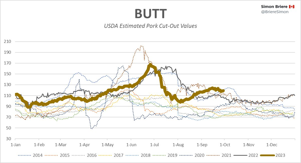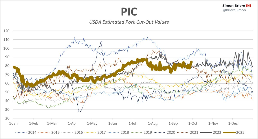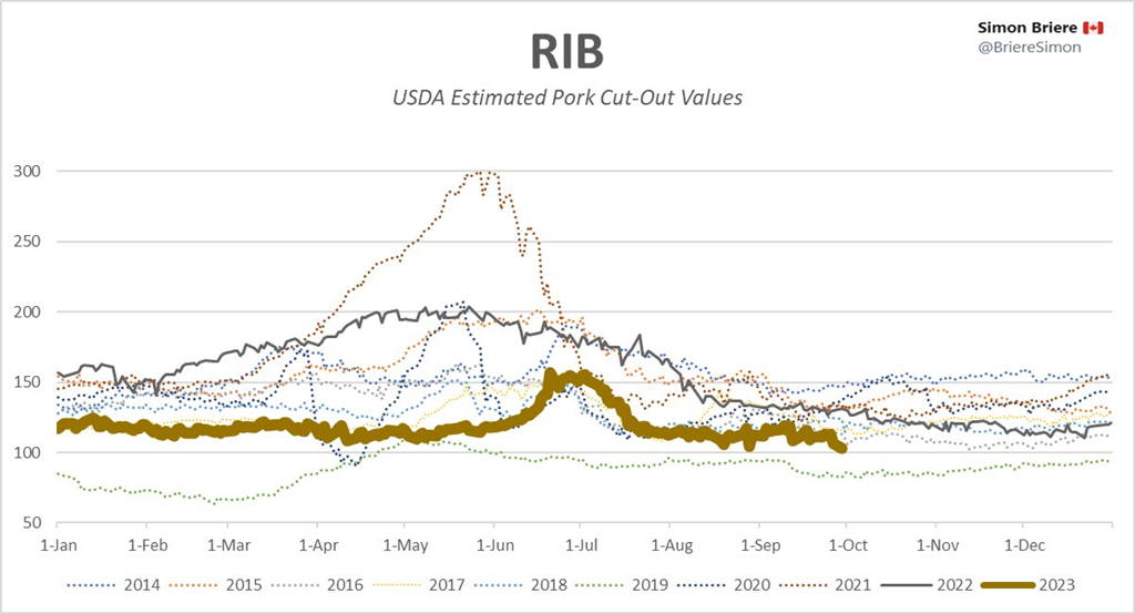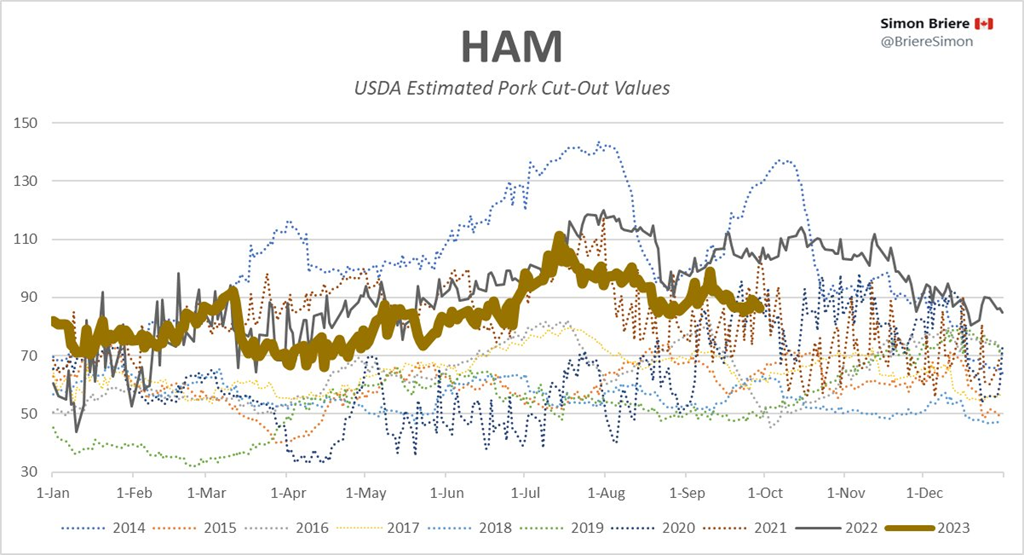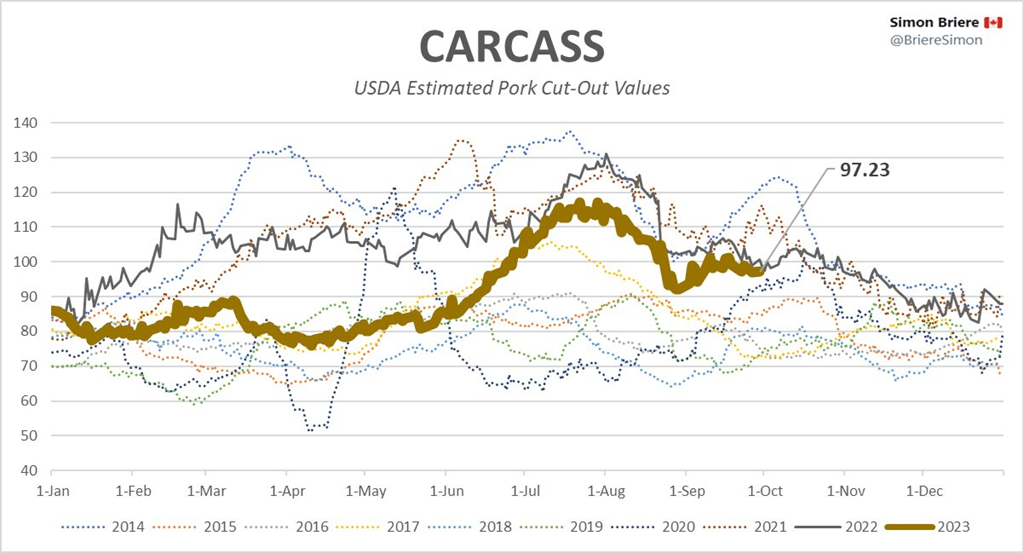 Le ministère de l'agriculture publie à chaque jour la valeur des différentes coupes. On appelle l'ensemble des coupes la "carcass". Le prix est calculé en cents la livre. Actuellement la carcasse vaut 97.23 cents la livre.