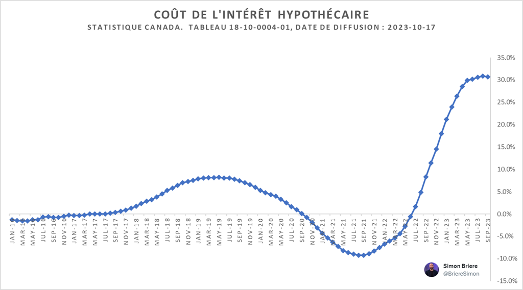 D'ailleurs, les propriétaires pourront vous en parler. Le paiement hypothécaire est 30% plus élevé cette année par rapport à septembre 2022. La hausse des taux d'intérêts fait grimper la facture. Et 30% c’est une moyenne, j’ai parfois vu des hausses de 50% des mensualités. Une hypothèque à 2000$ est rendu 3000$, une augmentation de mille piasse par mois…. 1000$ par mois DE PLUS… ça te magane un budget familial sur un ostifie de temps!