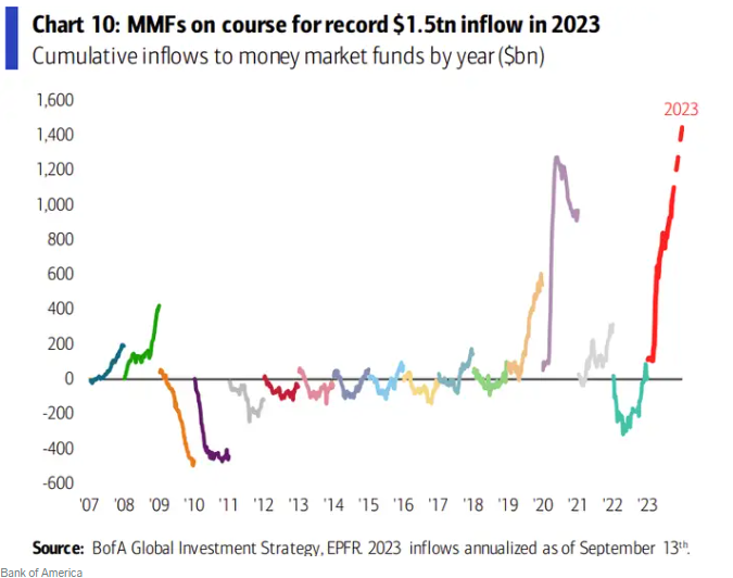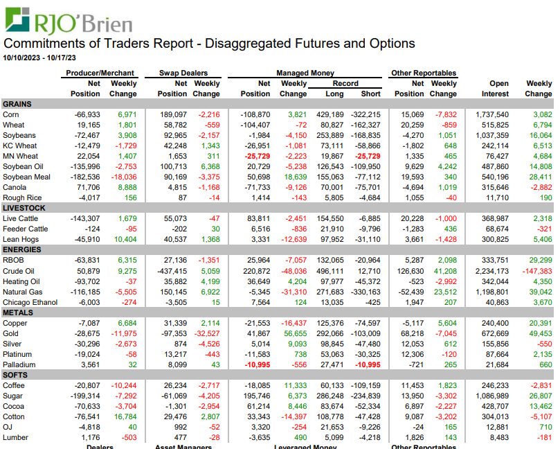 Les plaques tectoniques des marchés vont secouer les portefeuilles de bien des gens dans les prochains mois. Et ça commence à se sentir dans le monde financier agricole. Les fonds d’investissement et spéculateurs ont tendance à délaisser les marchés pour aller probablement mettre leur argent en sécurité. Le tableau ci-bas n’est qu’un exemple du mouvement des spéculateurs dans les marchés la semaine dernière (données compilées jusqu’au mardi). On peut déceler que dans la grande majorité des produits, les fonds ont diminué leur exposition nette soit en achetant soit en vendant des contrats à terme (ou options). On ramène peu à peu l’exposition nette vers 0. Un exemple parmi tant d’autre, un fond comme le Invesco Agriculture Fund (DBA) au cours de la dernière année a perdu près de 50% de ses épargnants. Non pas que le fonds ne performe pas, au contraire, mais les gens ont tout simplement retiré leurs billes de ce fonds (1,5 milliards sous gestion en aout 2022 versus 852 millions en aout 2023). Il est normal de constater ce changement. Pourquoi risquer des pertes en Bourse quand on peut engranger des rendements de 5 ou 6% sans risque dans les obligations? La diversification connait ses meilleurs jours alors qu’un partage plus égal se fait entre les actifs risqués et les titres à revenus fixes (obligations). Il y aurait plus de 1.5 trillions de dollars dans les fonds de marché monétaires ces temps-ci (fonds court terme investis dans le bons du trésors par exemple!).