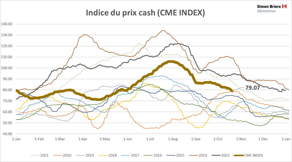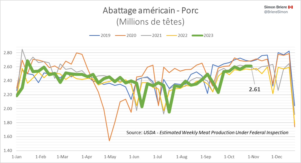 Une grande surprise attendait ceux qui pensent que nous aurons moins de viande… (et j’en suis). Le USDA a rapporté que les abattoirs avaient traité 2.61 millions de porcs la semaine dernière. C’est majeur puisque nous nous retrouvons avec 1.6% plus de porcs qu’en 2022. Et presque 1% de plus que les estimations initiales du Hog & Pig. Une année décevante à ce niveau….