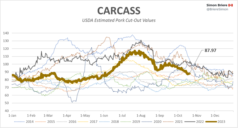 Le porc est secoué de tous les côtés ces temps-ci. Avec un prix cash en baisse et un prix de découpe en chute libre, les fondamentaux semblent s’éroder à la vitesse grand V!