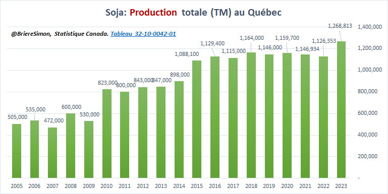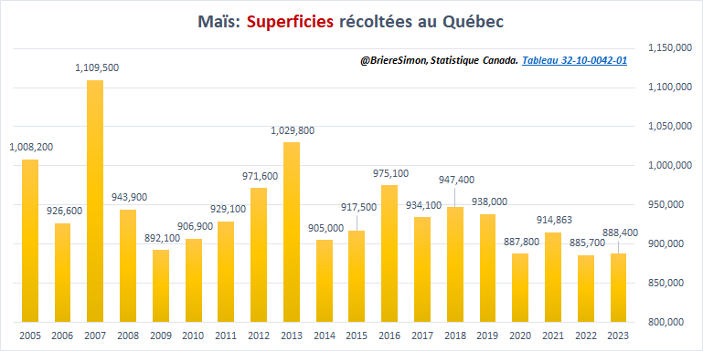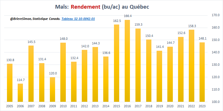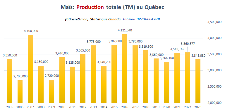 Au Québec, la production de maïs-grain a reculé de 6,1 % en 2023 par rapport à l'année précédente pour se chiffrer à 3,3 millions de tonnes. La superficie récoltée a augmenté de 0,3 % pour atteindre 888 400 acres, mais la hausse a été contrebalancée par la baisse des rendements, qui ont diminué de 6,4 % pour se chiffrer à 148,1 boisseaux à l'acre