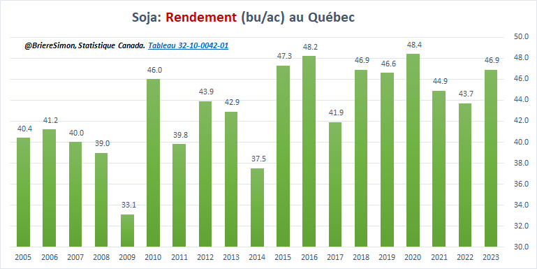 En 2023, les agriculteurs canadiens ont déclaré avoir produit davantage de maïs-grain et de soya, mais moins de blé, de canola, d'orge et d'avoine. Pour la plupart des cultures, la diminution de la production est en grande partie attribuable à une baisse des rendements particulièrement dans l'Ouest canadien, où les conditions de croissance ont généralement été plus sèches qu'en 2022.
