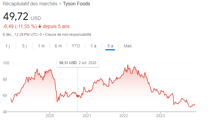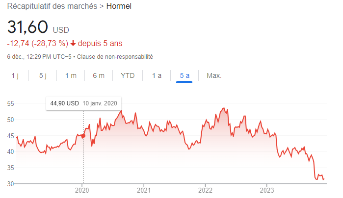 Des compagnies similaires aux États-Unis connaissent aussi des difficultés au niveau de leur performance boursière depuis 5 ans maintenant. Tyson Foods et Hormel peuvent se comparer à cette analyse bien sommaire.
