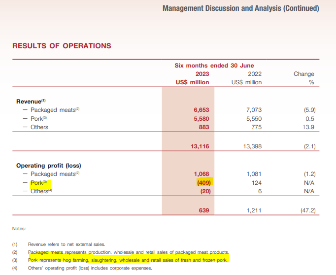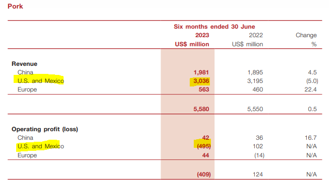 Qu’est-ce qui motive WH Group de relancer Smithfield en Bourse? Le seul objectif est de lever des fonds tout simplement. C’est un transfert de richesse d’un groupe à un autre. WH Group a probablement besoin d’argent frais dans ces coffres. La société rapporte ses profits et pertes de façon publique puisque l’action de WH Groupe est cotée sur la Bourse de Hong Kong. Les opérations porcines de WH Group ont perdu 409 millions USD pour les 6 premiers mois de 2023! (il y a d’autres divisions qui génèrent des flux positifs!) WH Group mentionne que les pertes d’opérations proviennent directement de sa filiale américaine (et mexicaine). 495 millions perdus en 2023 déjà! La division américaine représente tout de même 54% de ses revenus d’opération (même si le nombre de cochons abattus est nettement plus grand en Chine!)