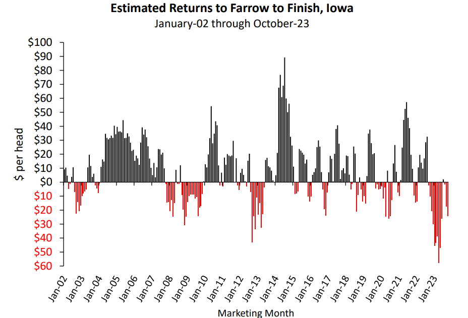 Pour poursuivre, le Iowa State University a compilé les marges bénéficiaires pour un naisseur-finisseur américain récemment. Non seulement, c’est une des plus longues séquences de pertes, mais c’est aussi la pire en terme de perte par tête. https://www2.econ.iastate.edu/estimated-returns/