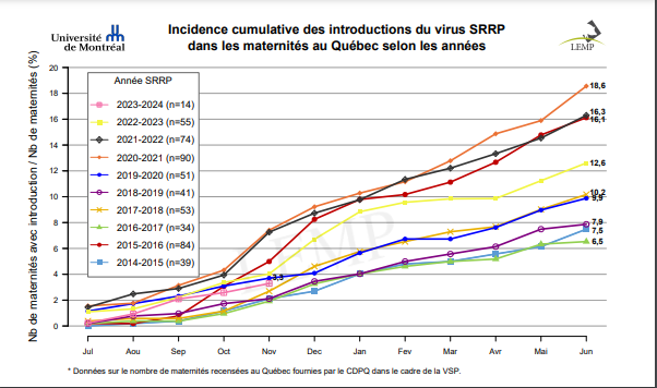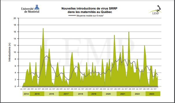 Au Québec, le Laboratoire d’épidémiologie et de médecine porcine recense les cas et analyse les données. Le Labo publie les introductions de virus SRRP dans les maternités et les types de souches en circulation au Québec. Voici les résultats publiés en décembre 2023.