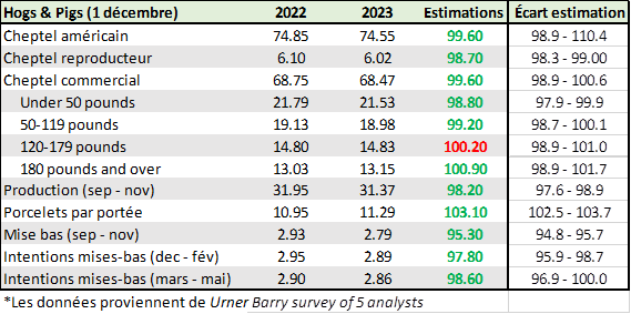 En parlant du USDA et en prévision du Rapport du USDA Hog & Pig qui sera publié le vendredi le 22 décembre, voici le tableau des attentes de différents analystes. Ces analystes sont courageux de mettre des chiffres de l’avant alors que le USDA peut réviser des données passées ce qui peut souvent changer le portrait des pourcentage et des variations. Le marché, pour la Xieme fois, anticipe une réduction du cheptel porcin américain (-0.40%) ainsi qu’une baisse du cheptel reproducteur (-1.3%) et une baisse importante des intentions de mise-bas pour 2024 (baisses entre 2.2% et 4.7%). Nous attendons avec impatience ce rapport vendredi après la fermeture des marchés (15 :00). Les prix réagiront seulement mardi le 26 décembre au matin et même temps que les gens qui veulent échanger leurs cadeaux de Noel durant le Boxing Day!