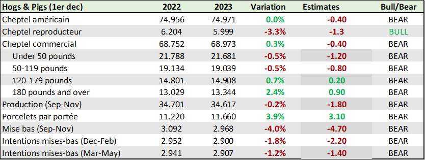 - Le seul élément positif de ce rapport : le nombre de truies diminuent, et ce , plus rapidement que les anticipations. Je pense que s’il y a UNE donnée susceptible de changer la mentalité du marché c’est probablement celle-ci. Au-delà de la production supérieure aux attentes et les intentions de mises-bas, le nombre de truies demeurent l’élément central de la production. Et si cette tendance se maintient, il est bien possible que la production puisse finalement baisser en 2024. Cela reste à voir cependant puisqu’il y a d’autres éléments.