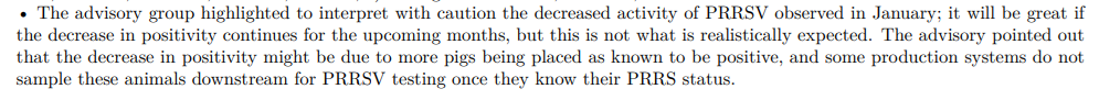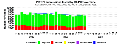 Et qu'en est-il du virus SRRP aux Etats-Unis? On me rapporte des commentaires de vétérinaires qui commencent à craindre une remontée des cas après une accalmie dans les derniers 18 mois. Pour l'instant, les dernières données du SDRS, n'indiquent rien de tel. Mais il faudra surveiller les anomalies sur ce front. Les producteurs demeurent nerveux sur ce sujet. Même les chercheurs sont un brin sceptiques sur la baisse récente des chiffres.