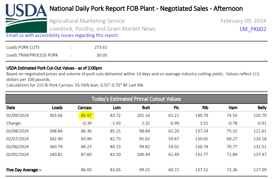 Pour le porc, et bien, les choses vont bien malgré tout la descente prévisible de cette semaine. Le prix du porc oscille entre différents vents contraires ces temps-ci. Après le fameux mirage du ''manque de porc'' des 3 premières semaines de 2024, on sent que le nombre de porcs disponibles est en nette augmentation depuis 2 semaines. La semaine dernière c’était 6% plus de porcs et cette semaine c’est 5,9% plus de porcs versus 2023! Et c'est pour cela le manque d'enthousiasme des contrats à terme cette semaine. Par contre, il m'est d'avis que ce ‘’manque’’ de porcs reviendra bientôt et j'entrevois une belle remontée des prix ce printemps.