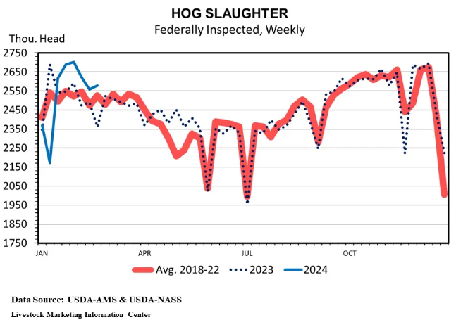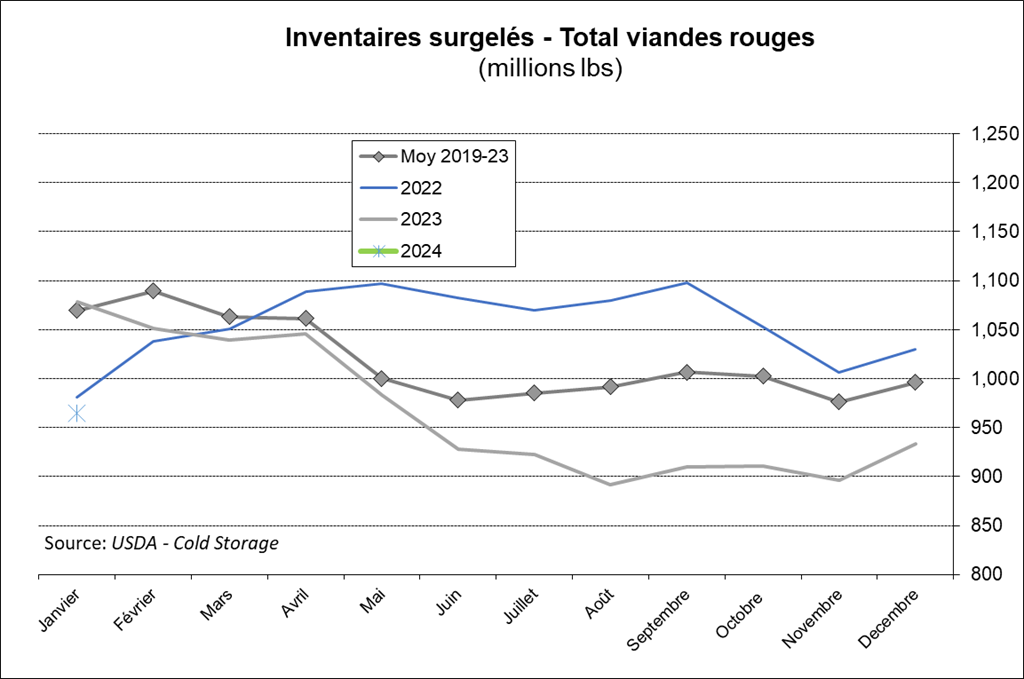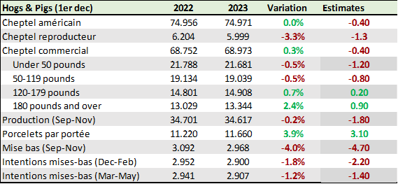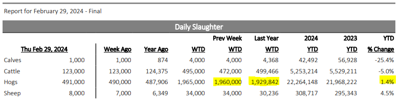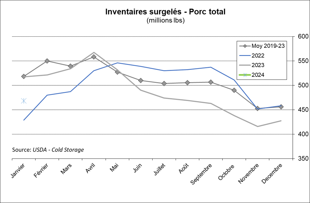 Premièrement, on si on regarde le dernier rapport Hog & Pig de décembre dernier, on devrait avoir une baisse des abattages présentement. Le rapport prévoyait que le cheptel des porcs 50 -119 livres serait en baisse de 0.5%. Or, ca ne semble pas être le cas du tout récemment. Quand on regarde au niveau de l’abattage depuis les dernières semaines, on note une dangereuse inclinaison vers une augmentation des abattages. Depuis le début de l’année, nous avons abattu 1.4% plus de porcs qu’en 2023. Et cette tendance ne semble pas prêt de s’essouffler. Il semble bien que cette semaine aussi nous nous dirigions vers une semaine d’abattage nettement supérieure à l’an dernier.