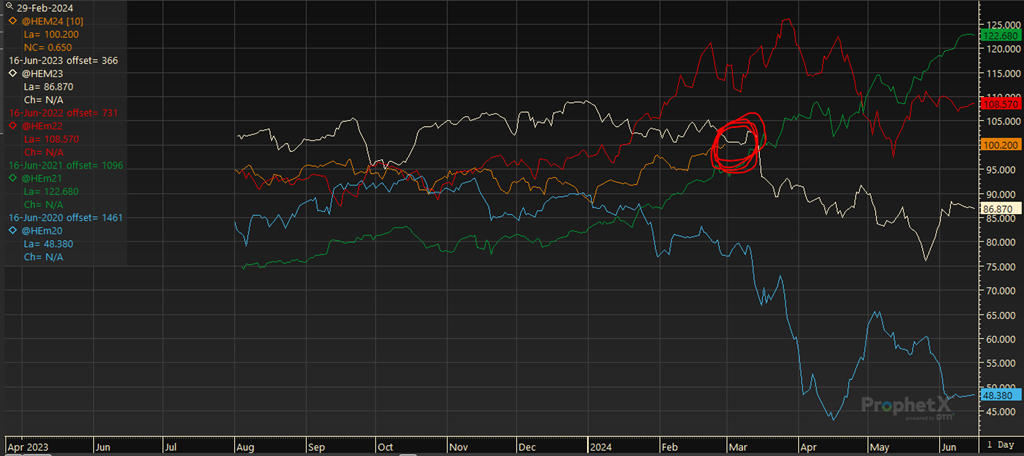 Les contrats de 2024 dans le porc se situent presque aux mêmes niveaux que 2023 au même moment dans l’année. Le contrat de juin 2023 a expiré à 86.87. Peut-on faire un corollaire avec l’année en cours? Certainement! Il existe des similitudes importantes même si, j’en conviens, il y a des choses plus intéressantes qui peuvent survenir durant la 2ieme moitié de 2024 (voir les raisons plus bas).