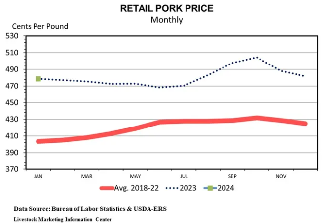 Et quand on vit de belles choses, on espère que cela perdure et c’est normal. Le problème, et cela arrive dans le porc plus que dans d’autres cultures ou élevages, on vit des cycles. Et après le cycle baissier de 2023, nous revoilà dans un cycle haussier. Pourtant 2023 avait des promesses qui ne se sont jamais réalisées ou du moins pas longtemps. Au début 2023, on croyait que les producteurs allaient considérablement et durablement baisser les cheptels, un peu de façon similaire à ce que les producteurs européens avaient débuté comme mouvement en 2022. Les contrats à terme affichaient une belle tenue jusqu’au début mars 2023. Les contrats d’été flirtaient avec des niveaux de 1.07 USD / livre. Et puis la réalité est venue rattraper : plus de porcs mis en marché que les rapports Hog & Pig des mois précédents indiquaient, une baisse de la consommation domestique en raison de l’incertitude économique, hausse des taux d’intérêt, la mise en place (finalement retardée) de la proposition 12 en Californie,. Toutes les excuses étaient bonnes pour faire baisser le prix du porc. Au même moment, le prix du bœuf grimpait à des niveaux inégalés!