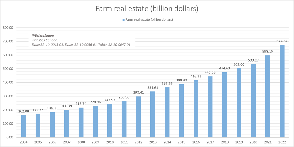 Alors voilà, regardons la vue d’ensemble. Est-ce que les fermes au Canada sont financièrement en santé? Ce que je retiens, c'est que les exploitations agricoles ont gagné beaucoup d'argent au cours des dernières années, que la valeur des terres a considérablement augmenté et que les capitaux propres agricoles sont élevés. Cependant, le niveau d’endettement record et l’augmentation des coûts de production vont nuire à la trésorerie des agriculteurs au cours des (quelques ?) prochaines années. Je pense que la plupart des fermes s’en sortiront, mais certaines exploitations agricoles plus endettées pourraient en souffrir davantage. C'est un cycle. Les prix des matières premières montent et descendent en fonction de l’offre et de la demande. La valeur nette de l’exploitation agricole est record, mais cela ne génère pas de cash-flow ; essentiellement juste la vente de récoltes et de bétail le permet, et les prix devraient baisser cette année. Attendez-vous à un certain niveau de stress cette année et peut-être la suivante, en fonction de la durée pendant laquelle les prix bas persisteront et de la durée pendant laquelle les taux d’intérêt élevés persisteront également. Je ne suis pas inquiet à court terme car les 2-3 dernières années ont été rentables, mais le vent tourne et les cash-flow seront plus serrés à l’avenir.