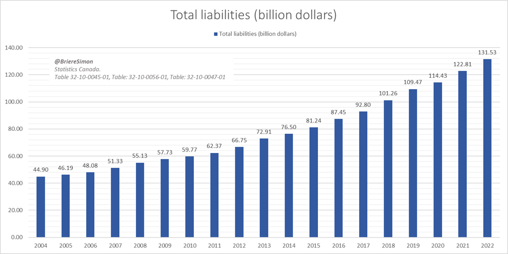 Je pense que le kicker est dans le passif…. Oui, les actifs sont RECORD. Mais la dette aussi. ET ELLE COÛTERA UNE FORTUNE. Les taux d’intérêt ne sont plus à 0 %. Le taux préférentiel actuel est de 7,20 %. Les dernières données de mon tableau sont de 131 milliards pour 2022, mais je pense qu'elles sont désormais de 138 milliards. Faites le calcul… 138 milliards à un taux d’intérêt de XX%, c’est BEAUCOUP D’ARGENT qui n’est pas consacré aux machines, aux terres, aux salaires, aux engrais, aux quotas, aux soins aux animaux, etc…