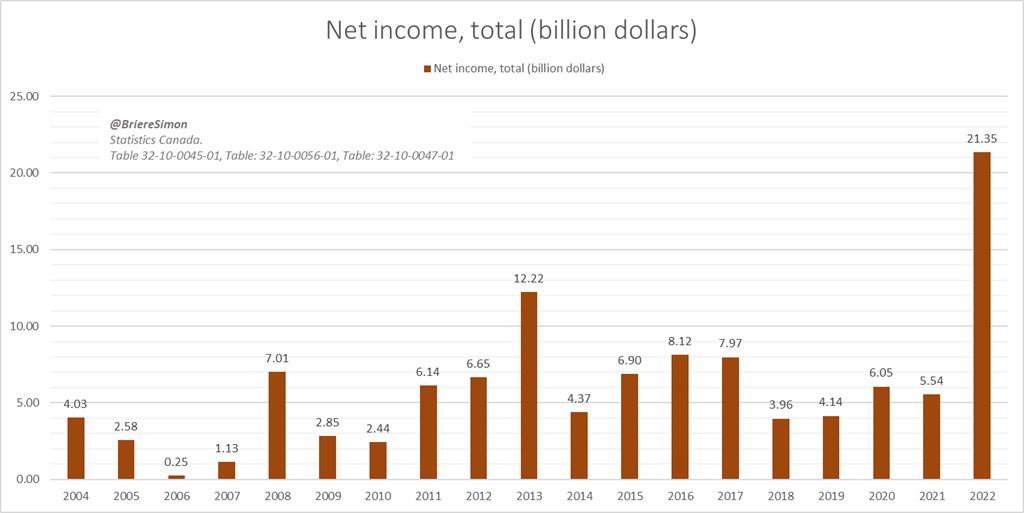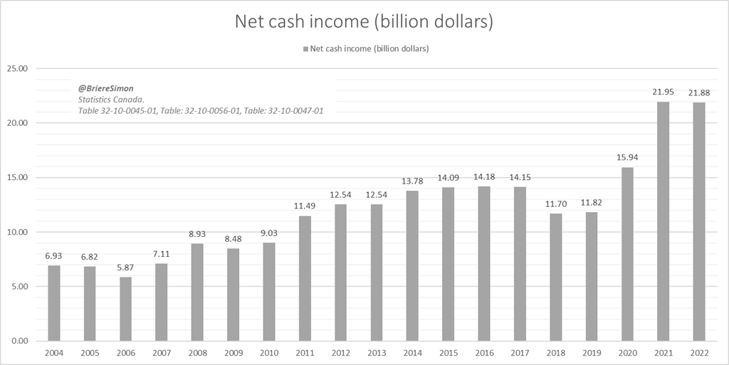 Je pourrais aussi inclure plus de revenus et de coûts comme l'amortissement ou la variation des stocks… finalement le revenu net est record à 21,35 milliards de dollars en 2022. En moyenne le revenu net est de 6 milliards par an pour toutes les fermes canadiennes. Le revenu net a augmenté un peu plus de 3 fois au cours des dernières années de pandémie. C’est un cycle, les prix des matières premières montent et descendent…