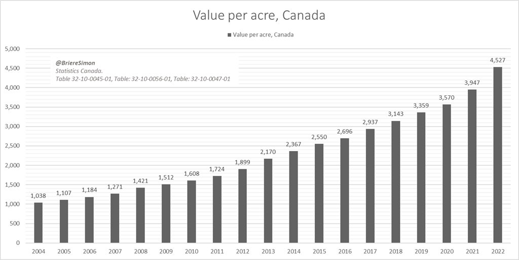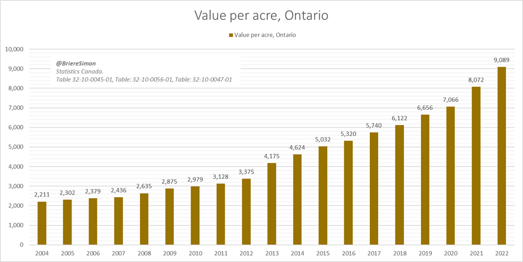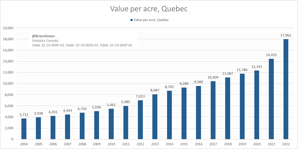 Valeurs similaires pour l'Ontario (+36 %). C'est une moyenne… Ne vous concentrez pas trop sur le chiffre, j'ai vu des acres dépasser largement les 30 000 acres dans certaines régions.