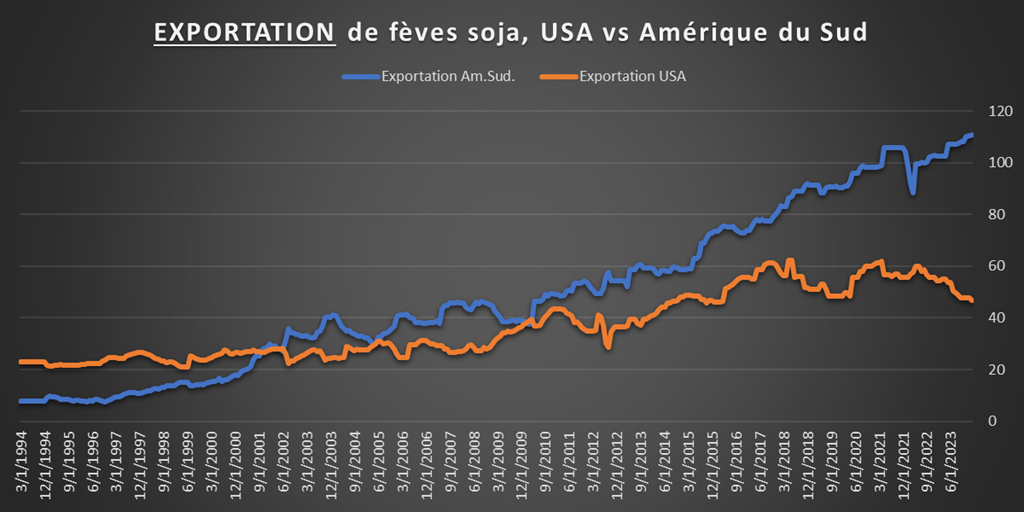 La production a drôlement augmenté, mais c’est aussi la part de marché de l’exportation qui a drôlement changé depuis 15 ans. Aujourd’hui les américains exportent à peu près 50 millions de tonnes par année. En moyenne. Des fois c’est plus 40 million, d’autres plus 60 millions. Mais disons que depuis 2015 c’est assez stable malgré tout à 50MMT. Sur la même période, l’exportation en Amérique du Sud, principalement au Brésil l’exportation a essentiellement doublé. L’exportation américaine est aujourd’hui bien en dessous de 50% du commencer mondial et le programme Brésilien domine largement.