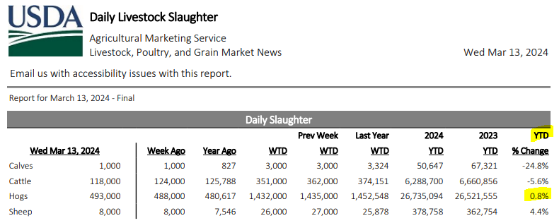 Par conséquent, il faudrait que les abattages augmentent et rapidement. Si jamais ces abattages devaient augmenter, cela voudrait dire des contrats à terme sont trop chers et pourraient ainsi chuter. Par contre, les contrats à terme semblent défier le USDA et ses perspectives de hausse de production. Dans mon Extra-viande de vendredi dernier, je disais que les contrats à terme 2024 étaient déjà en hausse par rapport à l’expiration des mêmes mois en 2023 de presque 18% sur avril / mai et juin. Mais le USDA prévoit tout de même une augmentation de 0.5% de la production porcine au 2ieme trimestre versus 2023. Si on résume, on a plus de porcs (+0.5% - c’est pas beaucoup), mais le marché propose un prix de 18% plus élevé versus 2023. Pour les mois de juillet et aout (et septembre), on parle d’une augmentation de 4% de la production porcine (plus de porcs) et des prix similaires à l’an dernier (sur les contrats à terme). Nous aurions donc PLUS de porcs et des prix égaux versus 2023? Encore une fois, le marché tient tête au USDA.