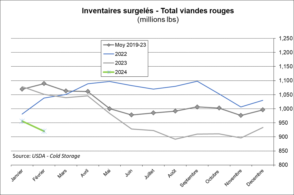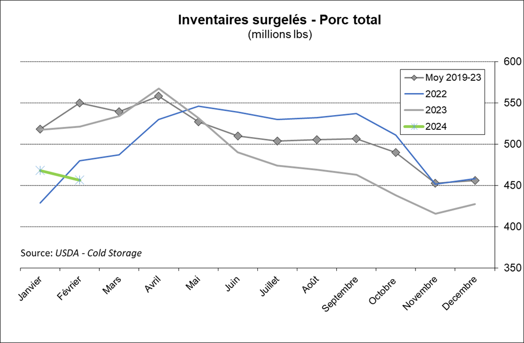 Avant de parler du rapport Hog & Pig qui s’en vient, revenons sur un rapport publié par le USDA ce lundi : Cold Storage. Rapport très positif pour les prix du porc et les données mettent un gros trait en crayon fluorescent sur la demande. Normalement, les inventaires auraient dû croitre ou augmenter de janvier à février, or, ce fut le contraire. Et les inventaires sont probablement les plus bas jamais enregistrés, pour un mois de février (dans l’ère récente on s’entend parce que les données de 1917 sont moins pertinentes!) . Moins de jarrets, moins de jambon, moins de longe, moins de côtes, bref, juste moins d’inventaire de porc! Et quand on regarde la quantité totale de viandes rouges, on s’aperçoit que la tendance demeure à la baisse. C’est 15% moins de viande dans les inventaires. Et tout ca en ayant produit plus et abattus plus de porcs. Par conséquent, on peut dire que la demande a été très forte pendant ce mois (février). Même dans le poulet, les inventaires sont 9 % plus faibles versus le 28 février 2023.