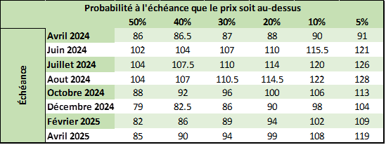 Pour vous donner une idées des attentes du marché concernant les prix pour les prochains mois, voici une matrice de probabilité telle que dérivé par les options sur les marchés. Le marché accorde une chance de 20% de voir $114 sur les mois de juillet et août. Ce n’est pas banal comme probabilité. Et intéressant! Et voir décembre à 90 USD / 100 livres! 1 chance sur 5 de voir et vivre une expiration historique. Jamais le prix n’a fini au-dessus de 87 USD /100 livres (2014). Par contre, peut-on atteindre ces niveaux si on produit plus de porcs? A voir!